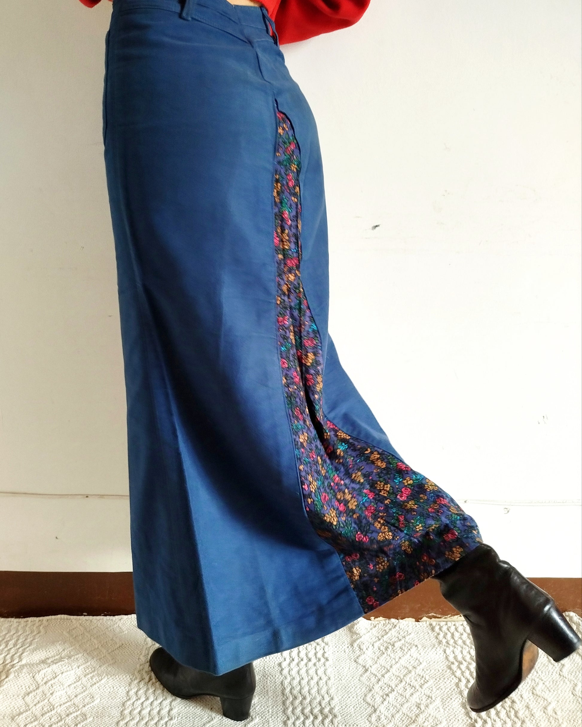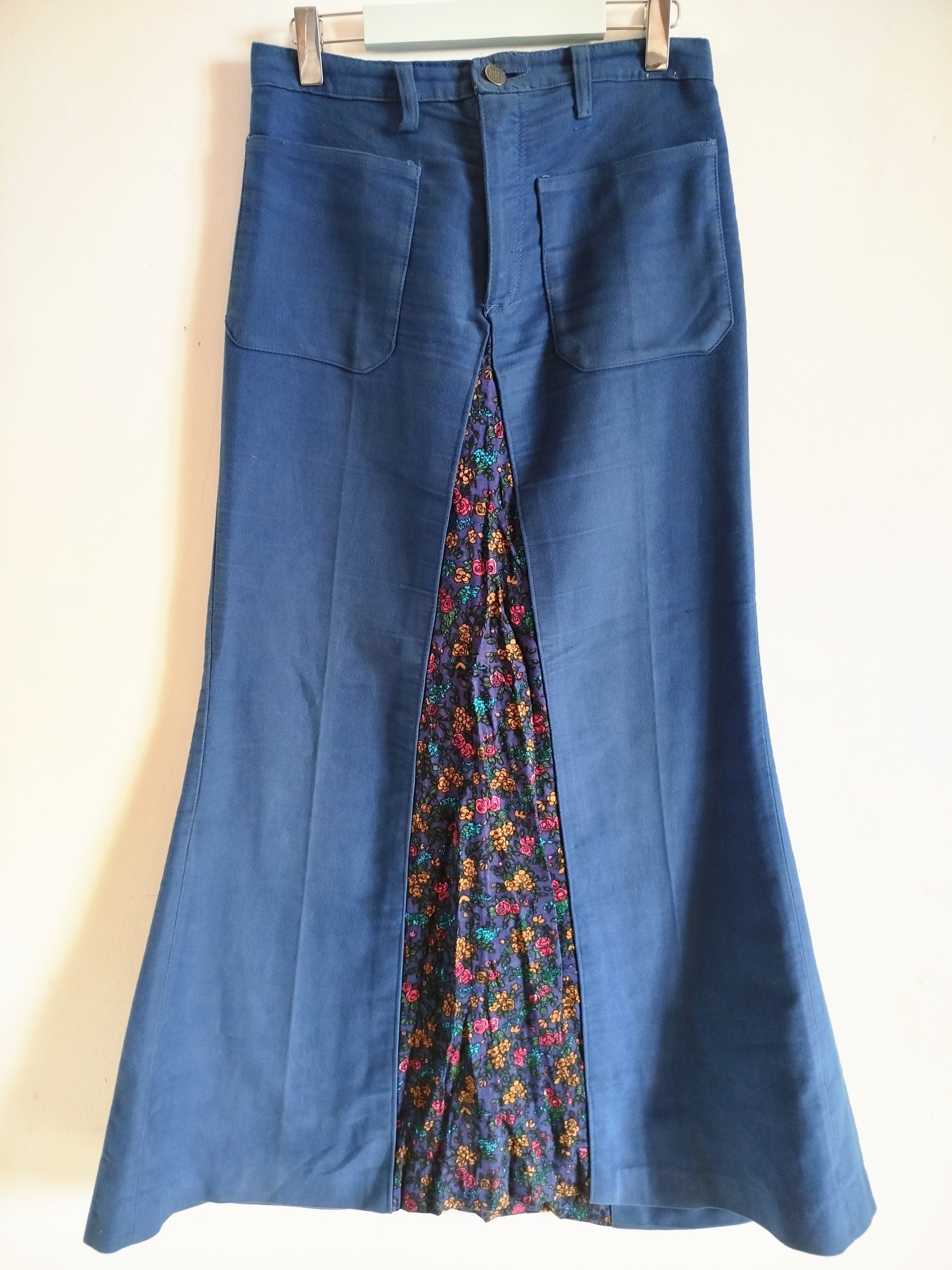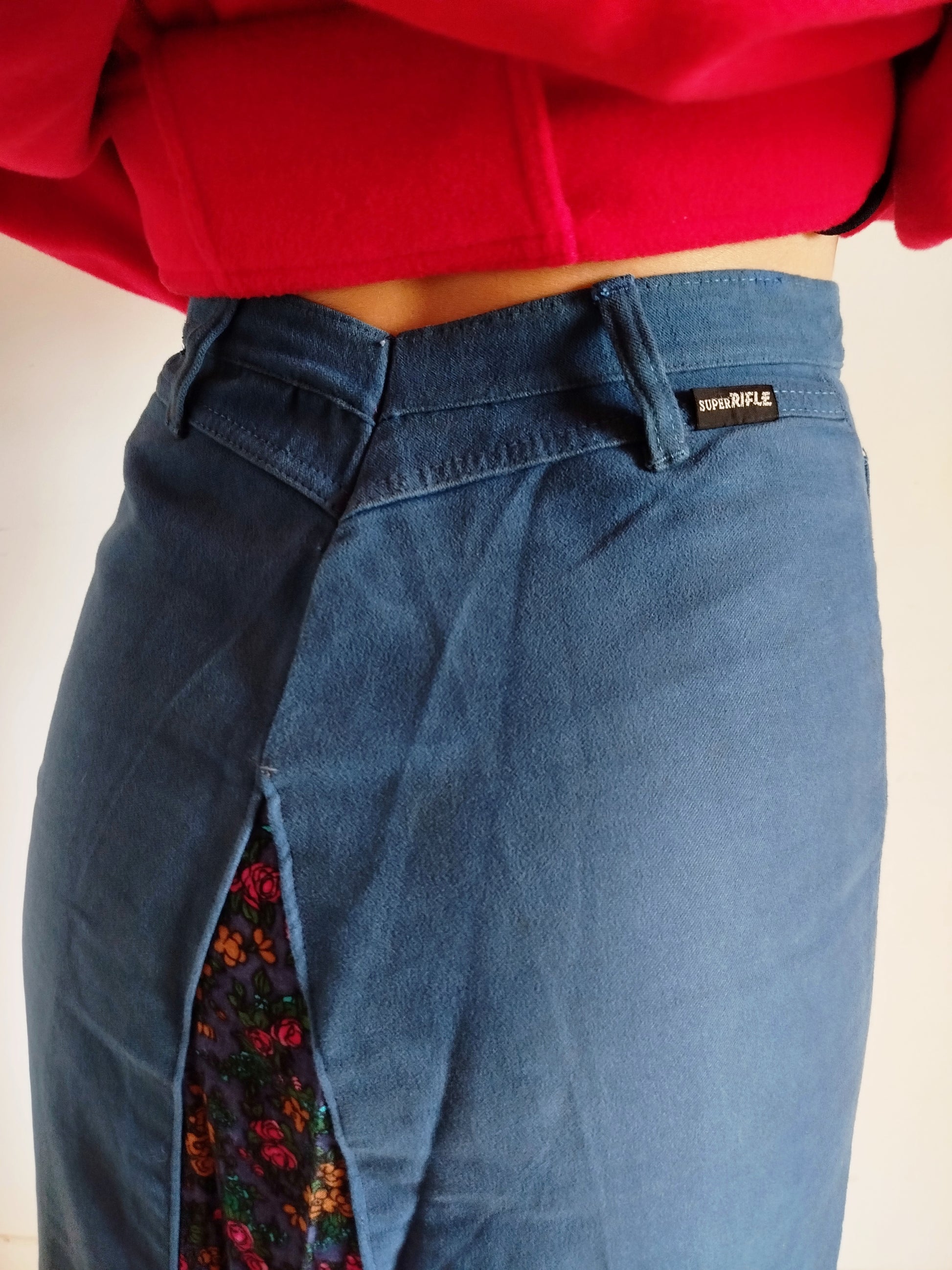 Gonna vintage superRifle anni’90. Colore blu jeans. Modello svasato sotto con inserti in fantasia floreale sul fronte e sul retro.