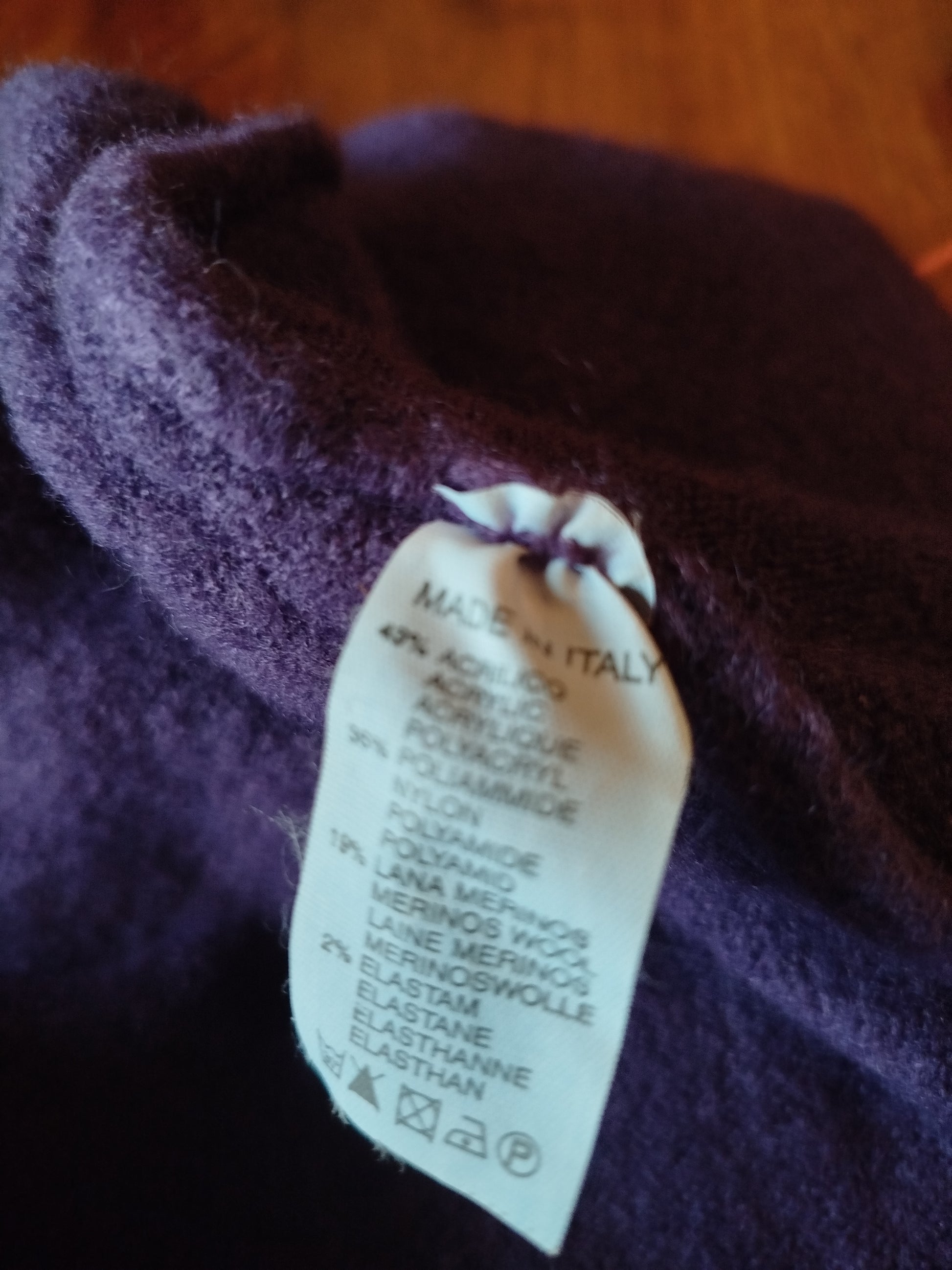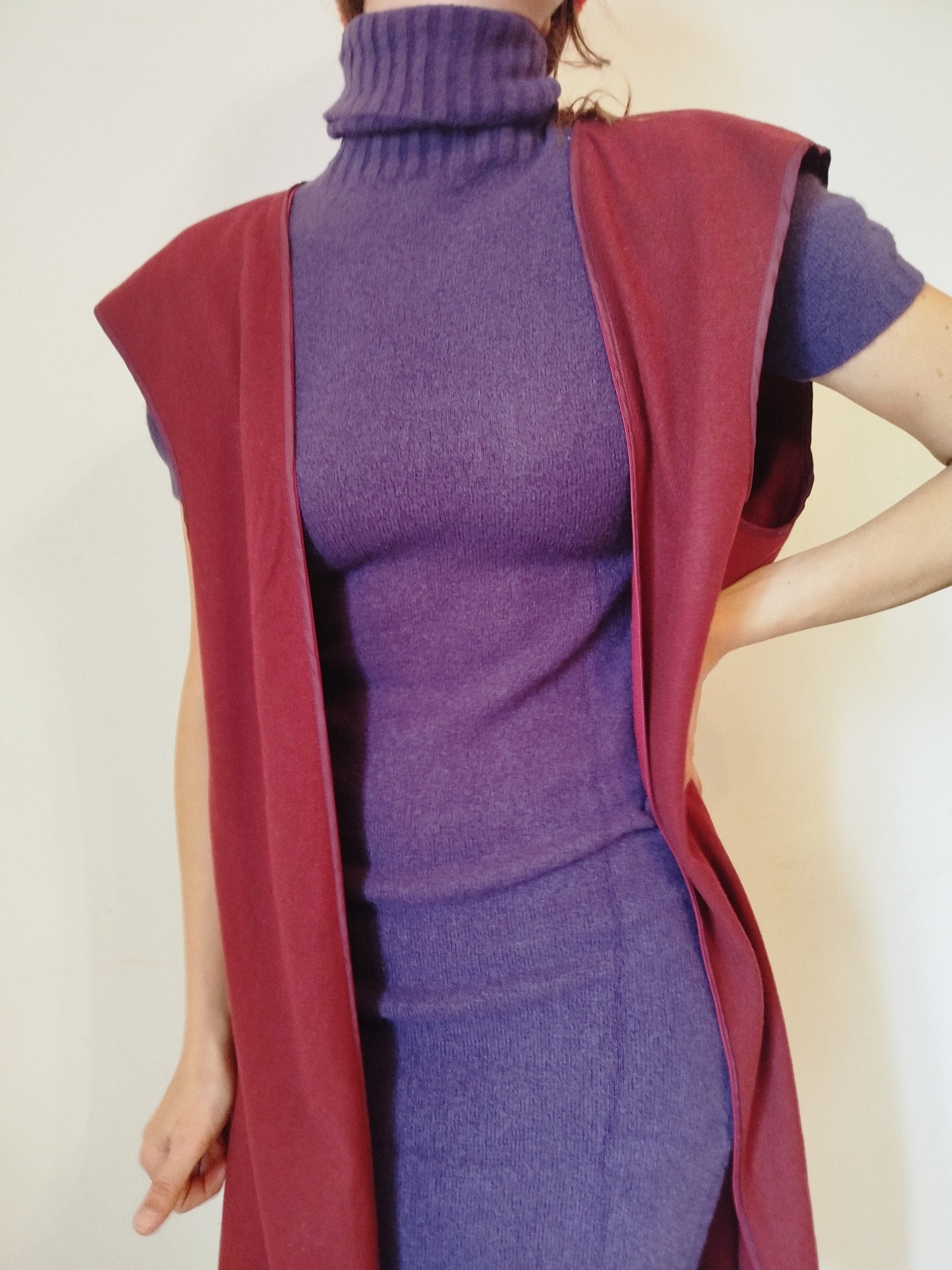 Vestito elasticizzato viola a collo alto e mezza manica. Il vestito è fasciante ma non segna data la morbidezza del tessuto. Lunghezza al ginocchio. Composizione mista 20% merinos. Nuovo. La modella in foto è tg42 e alta 1.78