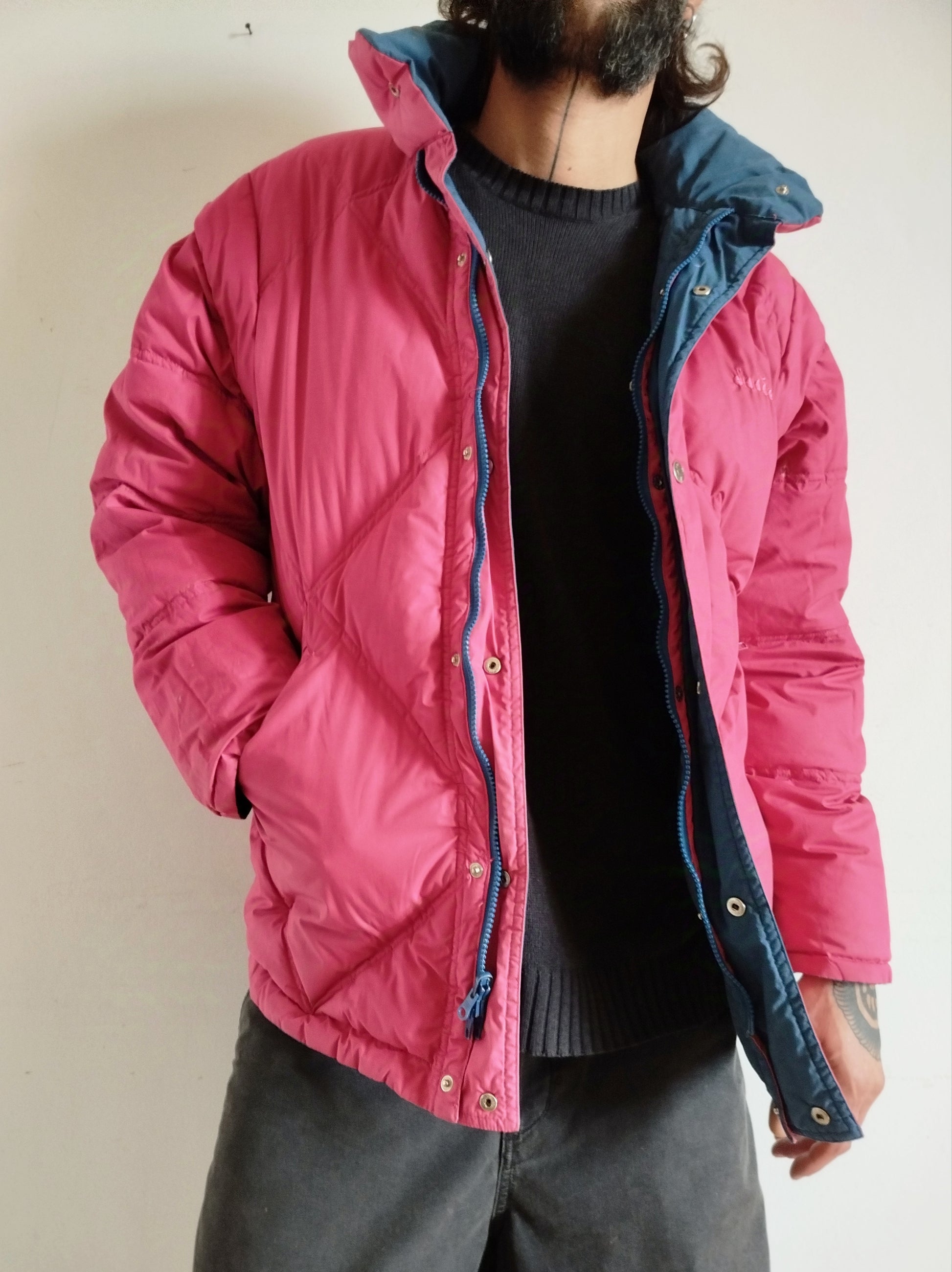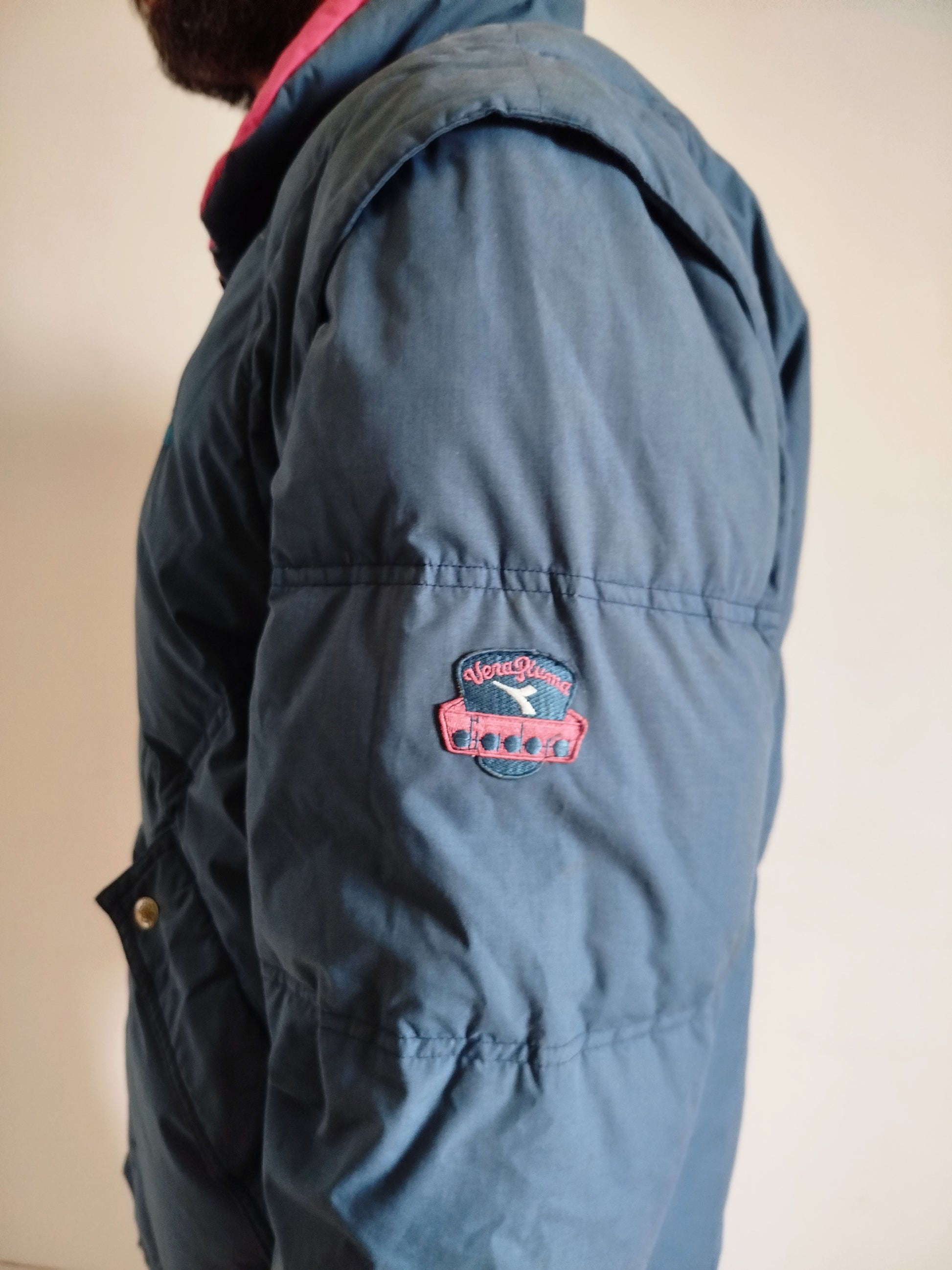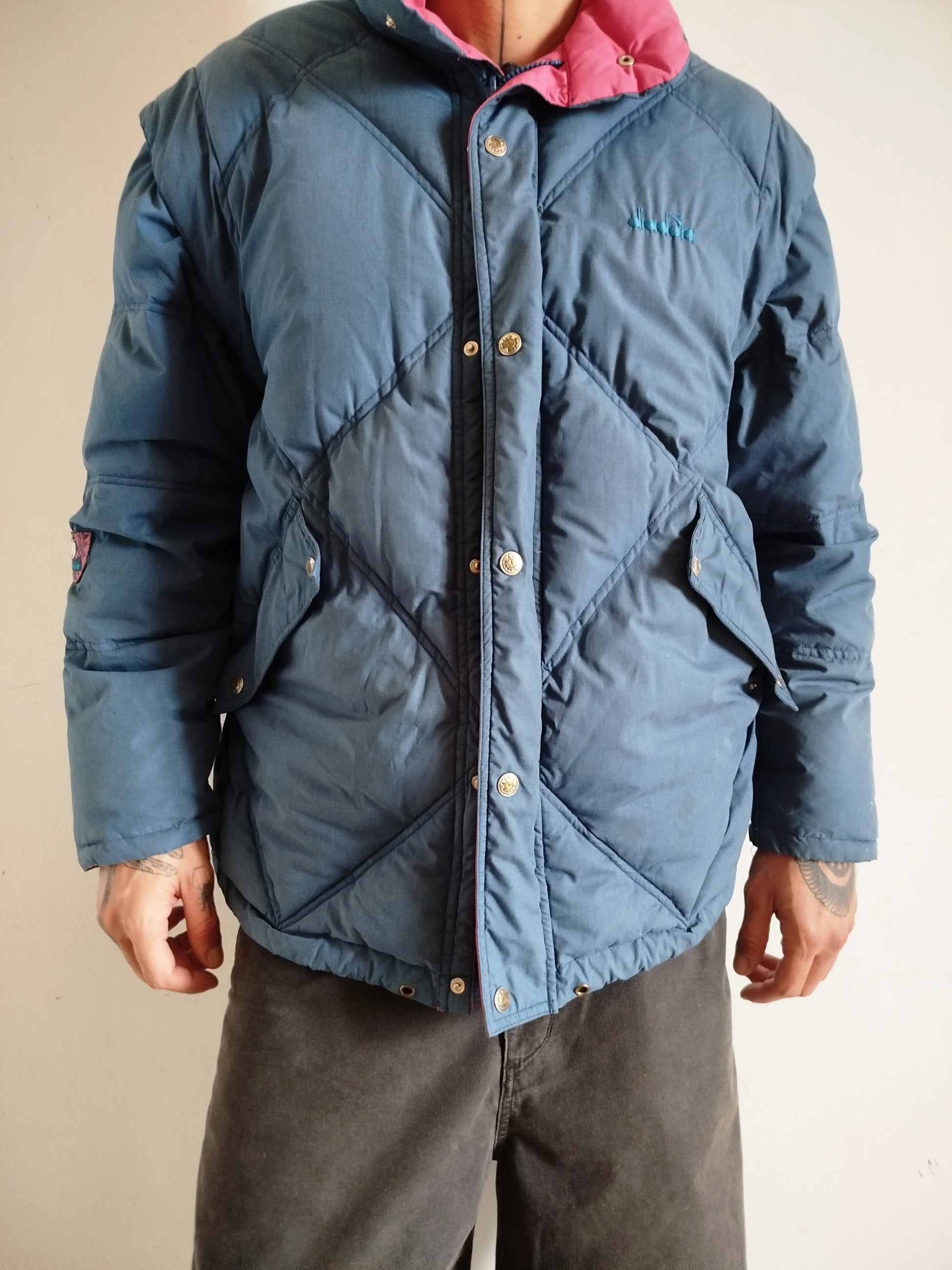 Giubbotto imbottito Diadora. Vintage anni ‘90. Super versatile può essere indossato sia dal lato blu che da quello rosa, con o senza le maniche.