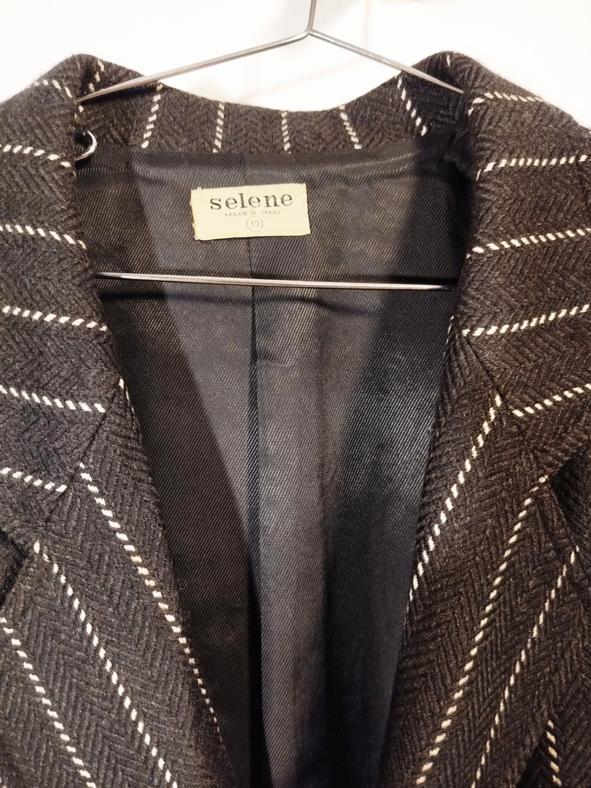 Blazer vintage doppiopetto. In pure lana nero gessato con intreccio a spiga.